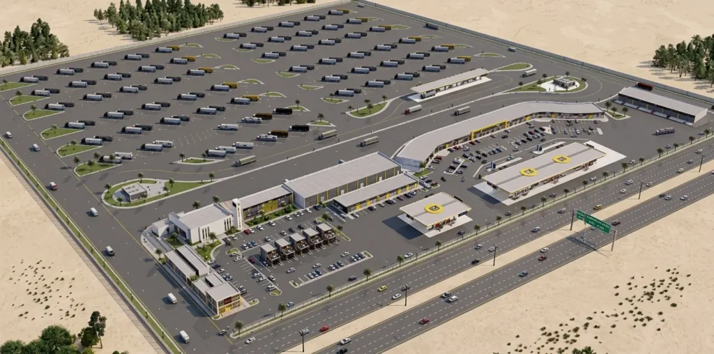 ويشمل المشروع مواقف تشغيل للشاحنات ومركبات النقل، إضافة إلى خدمات متكاملة مثل محطات الوقود، المطاعم، الاستراحات، المساجد ومراكز الخدمة، بما يوفر تجربة متكاملة للسائقين ويساهم في رفع جودة الخدمات وتعظيم العائد الاقتصادي الوطني.